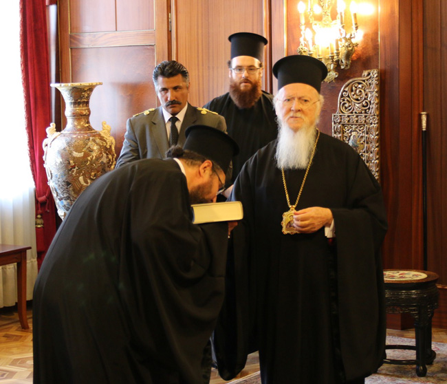 Στο πλαίσιο της πρώτης αυτής επίσημης επίσκεψης των Μελών της Επιτροπής του Συνοδικού Γραφείου στο Οικουμενικό Πατριαρχείο την Παρασκευή 10 Ιουνίου 2016, έγινε συνάντηση με τον εορτάζοντα Παναγιώτατο Οικουμενικό Πατριάρχη κ. Βαρθολομαίο στην Αίθουσα του Θρόνου του Οικουμενικού Πατριαρχείου.
