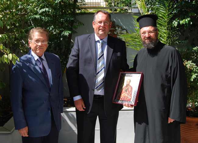 Τέλος, ο Πανοσιολογιώτατος Αρχιμ. κ. Σπυρίδων Κατραμάδος, Γραμματεύς του Συνοδικού Γραφείου των Προσκυνηματικών Περιηγήσεων της Εκκλησίας της Ελλάδος, εξέφρασε την ευχή να συνεχιστεί η συνεργασία και να υποδεχθεί στα Γραφεία της Ι. Συνόδου τον Εξοχώτατο κ. Πρέσβη του Ηνωμένου Βασιλείου στην Ελλάδα, καθώς και τον κ. Stauton, στον οποίο επέδωσε εκ του Μακαριωτάτου Αρχιεπισκόπου Αθηνών και Πάσης Ελλάδος κκ Ιερωνύμου, ενυπόγραφη Ιερή Εικόνα του Αποστόλου των Εθνών Παύλου, Ιδρυτού της Εκκλησίας της Ελλάδος.