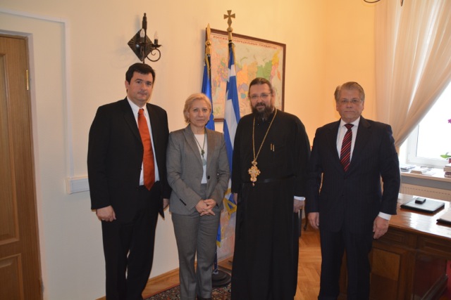 Η Αντιπροσωπεία της Εκκλησίας της Ελλάδος έγινε επισήμως δεκτή και από την Εξοχωτάτη κα Δανάη Κουμανάκου, Πρέσβυ της Ελλάδος στην Μόσχα. Η κα Πρέσβυς ενημερώθηκε από πλευράς Εκκλησίας για το έργο που επιτελεί το Συνοδικό Γραφείο Προσκυνηματικών Περιηγήσεων και σε συνεργασία με το Υπουργείο Τουρισμού, συζήτησε δε εκτενώς, επί μία και πλέον ώρα, για θέματα κοινού ενδιαφέροντος και επαίνεσε την Εκκλησία της Ελλάδος για «την καλή εξωστρέφειά της» με τη συμμετοχή της σε Διεθνείς Εκθέσεις Τουρισμού, όπως η ΜΙΤΤ 2014.
