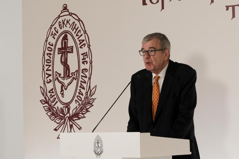 Κατόπιν, έλαβε τον λόγο ο Πρόεδρος της ΕΣΕ επί της Ακαδημίας Εκκλησιαστικών Τεχνών, Αιδεσιμολ. Πρωτοπρεσβύτερος κ. Θωμάς Συνοδινός, ο οποίος αφού ανέπτυξε τα ιστορικά, θεολογικά και αρχιτεκτονικά στοιχεία του Μνημείου προκειμένου να κατανοηθεί σε βάθος το περιεχόμενο και η σημασία του, τόσο στο εκκλησιαστικό, όσο και στο πολιτιστικό πλαίσιο, ευχαρίστησε θερμά το Ίδρυμα «Σταύρος Νιάρχος» (ΙΣΝ), τον καλλιτέχνη του έργου κ. Πραξιτέλη Τζανουλίνο και τους συνεργάτες του, τον Αρχιτέκτονα Πολιτικό Μηχανικό κ. Παντελεήμονα Στεφανή και τον Γραμματέα της ΕΣΕ επί της Ακαδημίας Εκκλησιαστικών Τεχνών Πανοσιολογιώτατο Αρχιμανδρίτη κ. Αθηναγόρα Σουπουρτζή.