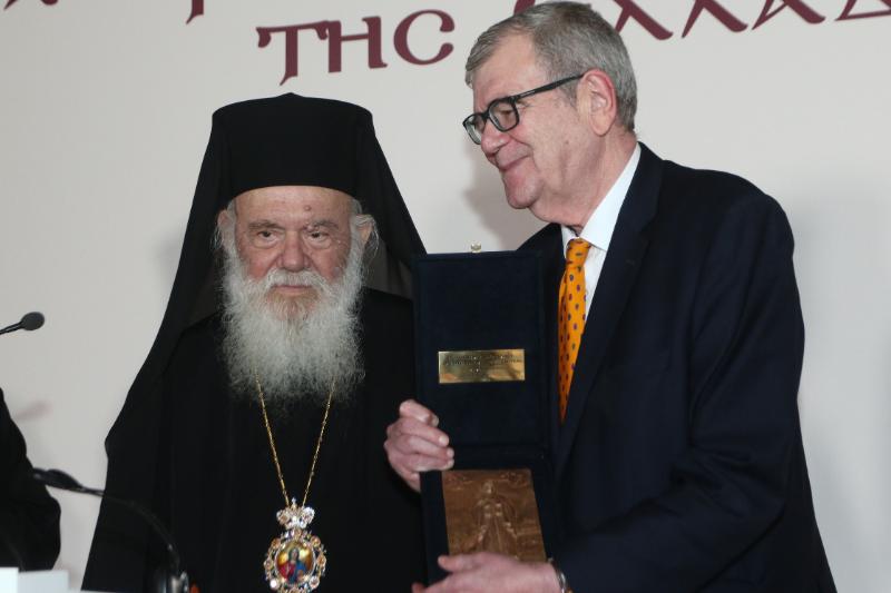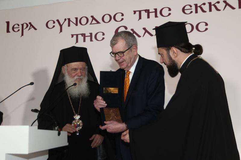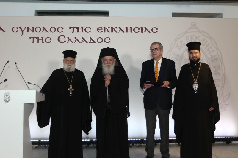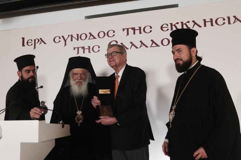 Αμέσως μετά, ο Μακαριώτατος απένειμε τιμητικώς στον Εκπρόσωπο του Ιδρύματος «Σταύρος Νιάρχος» (ΙΣΝ) κ. Γεώργιο Αγουρίδη πιστό αντίγραφο της ανάγλυφης απεικόνισης της Οσιομάρτυρος Αγίας Φιλοθέης της Αθηναίας, όπως αυτή φιλοτεχνήθηκε στο Μνημείο, εις ανάμνησιν των εν λόγω λαμπρών Εγκαινίων.