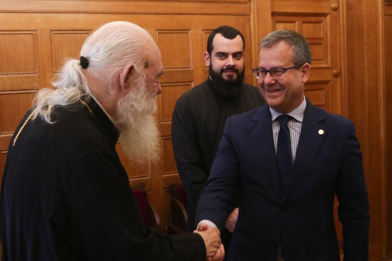 Το μεσημέρι, τον Αρχιεπίσκοπο Αθηνών και πάσης Ελλάδος κ. Ιερώνυμο επισκέφθηκαν ο Κοσμήτορας της Θεολογικής Σχολής του ΕΚΠΑ κ. Εμμανουήλ Καραγεωργούδης, συνοδευόμενος από τον Αντιπρύτανη Διοικητικών Υποθέσεων, Φοιτητικής Μέριμνας και Δια Βίου Μάθησης κ. Χρήστο Καραγιάννη, τον Πρόεδρο του Τμήματος Θεολογίας κ. Ιωάννη Παναγιωτόπουλο, την Πρόεδρο του Τμήματος Κοινωνικής Θεολογίας και Θρησκειολογίας κα Κίρκη Κεφαλέα και τον Αναπληρωτή Καθηγητή και Αντιπρόεδρο του ίδιου Τμήματος κ. Ευστάθιο Λιανό-Λιάντη.