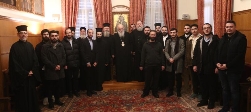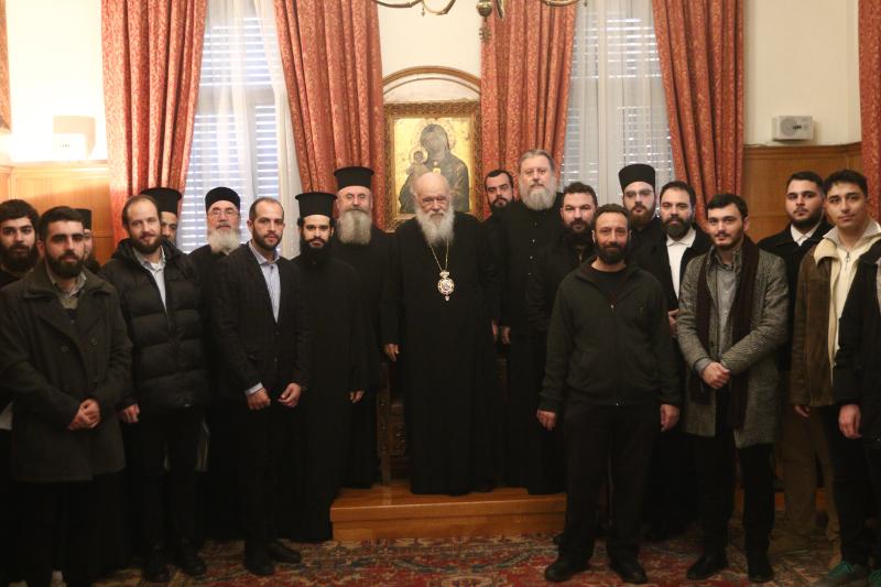 Αμέσως μετά, τα κάλαντα έψαλαν σπουδαστές από τη Σχολή Μαθητείας Υποψηφίων Κληρικών (Σ.Μ.Υ.Κ.). Τους σπουδαστές συνόδευαν ο Καθηγητής Μητροπολίτης Περιστερίου κ. Γρηγόριος, ο Επίσκοπος Ταλαντίου κ. Θεολόγος, Γενικός Διευθυντής του Ι.Π.Ε. της Ι.Α.Α., ο οποίος μετέφερε στον Αρχιεπίσκοπο ευχές εκ μέρους του ΕΣΕΕ, καθώς και ο Διευθυντής της ΣΜΥΚ – Ριζαρείου, Αρχιμανδρίτης Πολύκαρπος Κάστιζας, μαζί με καθηγητές της Σχολής.