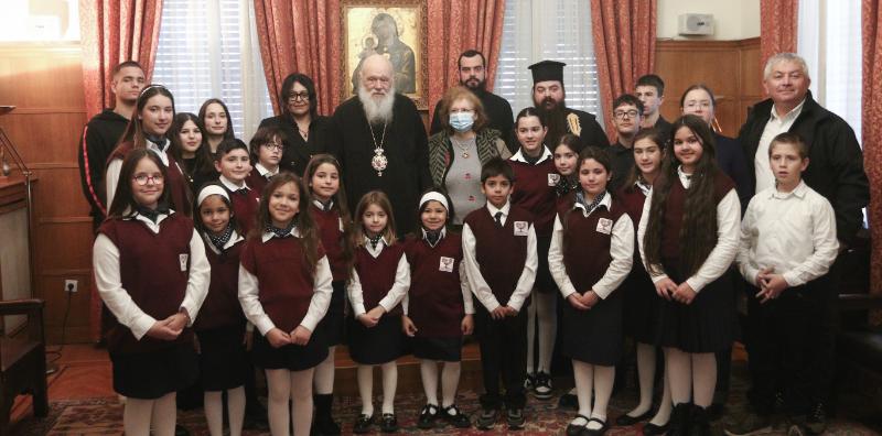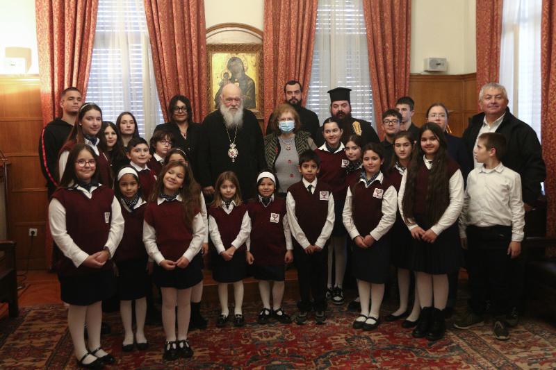 Στη συνέχεια, παραδοσιακά χριστουγεννιάτικα τραγούδια έψαλαν στον Μακαριώτατο παιδιά από τη Δομή Φιλοξενίας Προσφύγων – Μεταναστών «ΣΥΝΥΠΑΡΞΙΣ». Τα παιδιά, συνοδευόμενα από τον Πρόεδρο της Διοικούσας Επιτροπής, Μητροπολίτη Ιλίου, Αχαρνών και Πετρουπόλεως κ. Αθηναγόρα, και τον Γενικό Διευθυντή, Αρχιμανδρίτη π. Παντελεήμονα Παπασυνεφάκη, συνομίλησαν με τον Αρχιεπίσκοπο και του ευχήθηκαν καλά Χριστούγεννα. Από την πλευρά του, ο Μακαριώτατος ενδιαφέρθηκε να μάθει από πού κατάγονται τα παιδιά, για τις ανάγκες και τα προβλήματά τους, και τους ευχήθηκε με τη σειρά του καλά Χριστούγεννα, με υγεία και δύναμη, ενώ συνεχάρη τον Μητροπολίτη Ιλίου και τον π. Παντελεήμονα για το σημαντικό έργο της ΑΜΚΕ.