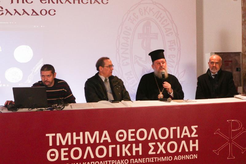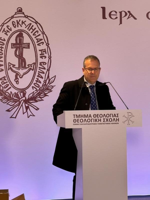 Τον Μακαριώτατο Αρχιεπίσκοπο Αθηνών και πάσης Ελλάδος κ. Ιερώνυμο και τους Σεβασμιωτάτους Συνοδικούς Μητροπολίτες προσφώνησε ο Πρόεδρος του Τμήματος Θεολογίας της Θεολογικής Σχολής του ΕΚΠΑ, Ελλογιμώτατος Καθηγητής κ. Ιωάννης Παναγιωτόπουλος, ο οποίος στην αρχή της σύντομης προσφώνησής του, ανέφερε ότι η παρουσία του Μακαριωτάτου είναι μια ζωντανή επιβεβαίωση του άρρηκτου δεσμού μεταξύ της διδάσκουσας και της ποιμαίνουσας Εκκλησίας, και συνεχίζοντας τόνισε: “Η Θεολογική Σχολή του Πανεπιστημίου Αθηνών, από την ίδρυσή της το 1837, υπήρξε το κέντρο της θεολογικής καλλιέργειας στην Πατρίδα μας. Σήμερα, καθώς υποδεχόμαστε τους νέους προπτυχιακούς και μεταπτυχιακούς φοιτητές μας, επαναφέρουμε στην μνήμη μας, Μακαριώτατε, το όραμα του μεγάλου προκατόχου Σας, του Μακαριστού Αρχιεπισκόπου Αθηνών Χρυσοστόμου Α´ Παπαδοπούλου. Εκείνος, σε μία εποχή κρίσης και προσφυγιάς μετά το 1922, κατέδειξε ότι η Εκκλησία δεν είναι μόνο διοικητικός οργανισμός, αλλά και πνευματικό σώμα με φωνή επιστημονική και θεολογική. Με την ίδρυση του περιοδικού «Θεολογία» το 1923, γεγονός που εορτάσαμε με τη δική σας επίνευση, έδωσε στην Εκκλησία της Ελλάδος το βήμα να μιλήσει με τη δική της φωνή, καθιστώντας την συνομιλητή του παγκόσμιου πολιτισμού. Αυτήν την παρακαταθήκη υπηρετούμε και εμείς σήμερα στο Τμήμα Θεολογίας, το αρχαιότερο και σπουδαιότερο Τμήμα στον Ορθόδοξο κόσμο.”. Κλείνοντας την προσφώνησή του, ευχαρίστησε τον Μακαριώτατο για την πατρική του αγάπη και για όσα ευγενώς προσφέρει προς τιμήν της ακαδημαϊκής κοινότητας.