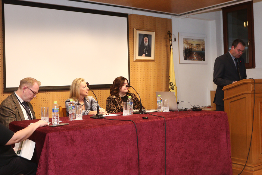 Κατόπιν, χαιρετισμό απηύθυναν ο Εκπρόσωπος της ΑΘΠ του Αρχιεπισκόπου Κωνσταντινουπόλεως, Νέας Ρώμης και Οικουμενικού Πατριάρχου κ. Βαρθολομαίου Μητροπολίτης Λαοδικείας κ. Θεοδώρητος, ο Εκπρόσωπος της ΑΘΜ του Πατριάρχη Ιεροσολύμων κ. Θεοφίλου Γ΄, αρχιμ. π. Χερουβείμ Μουστάκας. Το μήνυμα του Αρχιεπισκόπου Τιράνων, Δυραχίου και πάσης Αλβανίας κ.κ. Ιωάννη ανέγνωσε ο Μητροπολίτης Απολλωνίας και Φίερι κ. Νικόλαος. Επίσης, χαιρετισμό απηύθυναν ο Αντιπρύτανης Διοικητικών Υποθέσεων, Φοιτητικής Μέριμνας και Διά Βίου Μάθησης του Εθνικού και Καποδιστριακού Πανεπιστημίου Αθηνών (ΕΚΠΑ) καθηγητής κ. Χρήστος Καραγιάννης, ο Κοσμήτορας του Sankt Ignatios College, Σουηδία, καθηγητής κ. Michael Hjälm, η Πρόεδρος του Τμήματος Κοινωνικής Θεολογίας και Θρησκειολογίας και Διευθύντρια του Εργαστηρίου Θρησκειολογίας και Βιοηθικής των Θρησκειών «Βασίλειος Φανάρας» του ΕΚΠΑ, καθηγήτρια κ. Κίρκη Κεφαλέα και η Διευθύντρια του Εργαστηρίου Κανονικού Δικαίου του ΕΚΠΑ, καθηγήτρια κ. Ειρήνη Χριστινάκη.